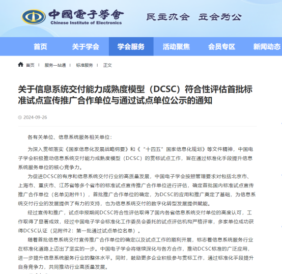近日,中国电子学会正式公布了信息系统交付能力成熟度模型(DCSC)符合性评估首批标准试点宣传推广合作单位名单,湖北省软件企业协会成功入选。中国电子学会推动信息系统交付能力成熟度模型(DCSC)的贯标试点工作,旨在深入贯彻落实《国家信息化发展战略纲要》和《“十四五”国家信息化规划》等文件精神,通过标准化手段提升信息系统服务单位的核心竞争力。